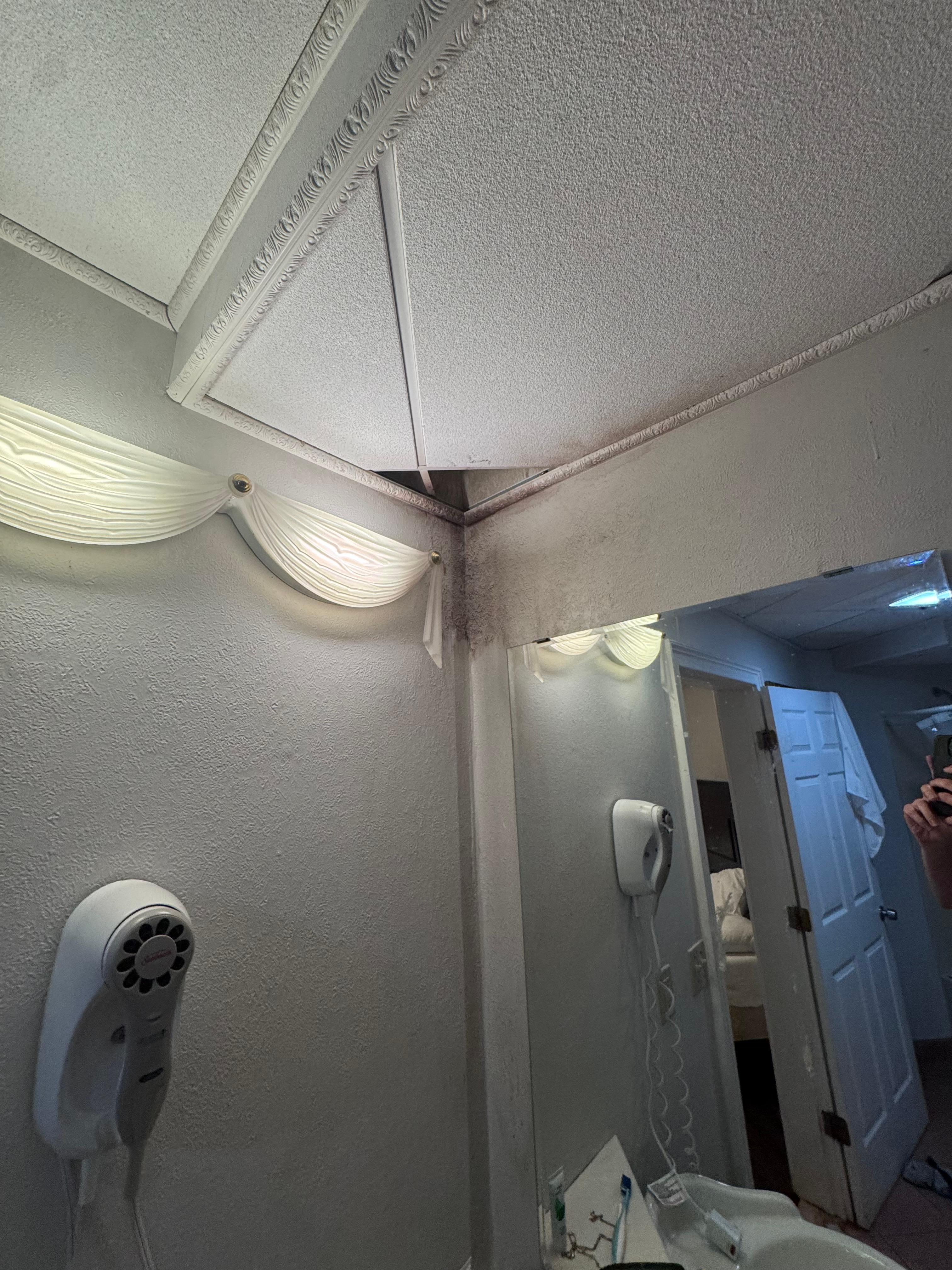 Room was older, a bit dusty around the edges, cobwebs hanging on the wall, tv covered in dust, empty nip bottle behind TV (was trying to find connection), old tangerine? and clutter behind nightstand. We won't talk about the dust bunnies etc. under the bed. I really wanted a bath, but standing in the shower made the tub floor creak and crack like I was gonna break through. Didn't think filling it with water was a good idea.