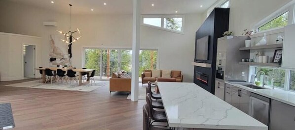 For entertainment, the cottage features a 75” smart home TV with an impressive sound system and a 60” fireplace. There are four bedrooms, including two master bedrooms with ensuite washrooms and two additional bedrooms with lofts, each accommodating a queen bed and a double bed. The smart home wiring allows for voice commands to control lighting and music.