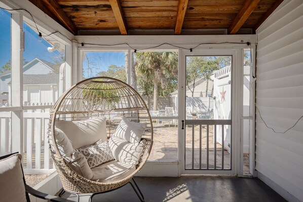 Just outside the side entrance door, you’ll find a roomy screened porch as well as access to the fenced backyard. Lounge in the egg chair or gather around the table for lunch under the shade and protection of the screened porch with a ceiling fan to keep you comfortable. Swim around in the private pool on those warm afternoons. Then gather around the backyard firepit as the evening breeze cools the air and exchange stories as you roast marshmallows.