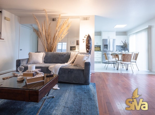 Cozy size living room area with a traditional fireplace, comfortable sturdy couch, accent chairs, 60 inch smart TV and decorated with arts made locally by Bay Area artists.