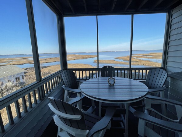 Direct Bayfront 2 bedroom/2 bath condo with amazing views! Corner unit with both western and southern facing balconies; offering breathtaking sunset views and plenty of warm natural light throughout the condo. Master bedroom offers a comfortable queen sized bed and a private screened in balcony with seating for 5 to enjoy dinner or drinks. Master bath has a large walk-in shower. Second bedroom features a full over full sized bunk bed, as well as a twin extra long bed. Guest bathroom has a tub/shower combination. Bright, open floor plan in the main living area with a cozy living room, dining area, and kitchen; all with spectacular views of the bay! The second large balcony off the living room offers another comfortable outdoor space to relax; with an additional large table and chairs. Although this is a third floor walk-up, the views are well worth it! This is a great mid-town location within walking distance of many of Ocean City’s finest restaurants. The beach is less than two blocks away and a easy walk across the street. There are no high rise buildings in this part of OC and therefore the beach is always far less crowed than other areas. There are two assigned parking spots for the unit. There is an outdoor shower for your convenience after a fun day at the beach. This is a wonderful location where you will truly enjoy the peace and serenity of the bay after a full day of exploring all that Ocean City has to offer!