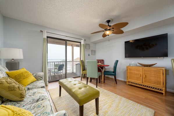 The condo is one of the best units that you will ever stay in! Beach theme and contemporary style living brings this condo to life. The living room is furnished with a comfy couch that doubles as a queen-size sleep sofa. The sliding balcony doors provide plenty of natural light to brighten the space, and in the evenings you can sit on the furnished balcony and watch the sunset. Next to the living area is the fully-stocked kitchen with new stainless steel appliances and a wide counter top with chairs. Great space to cook or grab a quick bite to eat from one of the many restaurants nearby.