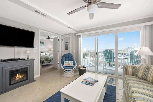 Bright and inviting with comfortable seating, a TV, and a full sleeper sofa for extra guests. Step out onto the private balcony to enjoy fresh ocean air and Midtown energy.