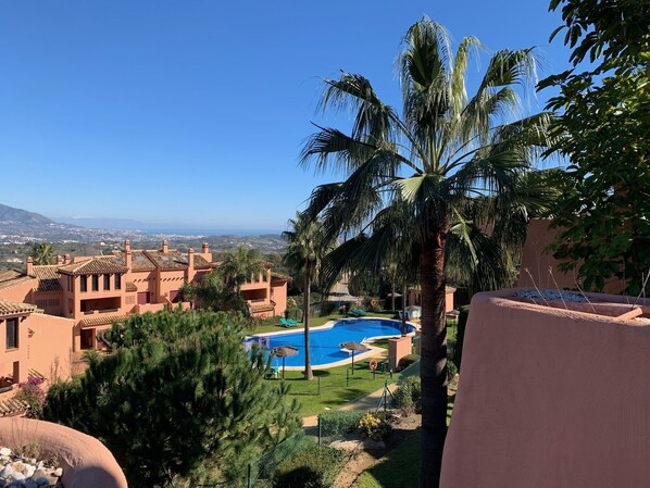 This spacious Penthouse apartment over looking the swimming pool has excellent facilities. Offers wonderful panoramic views of the sea and mountains This is a great size accommodation perfect for a family holiday and golf getaway.