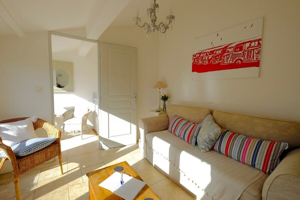 Yläkerrassa on tilava kahden hengen huone, runsaasti säilytystilaa ja suihkuhuone vieressä 1. kerroksessa; ja 2. kerroksesta löydät ihastuttavan olohuoneen, jossa on sävylasiovet, jotka aukeavat ja taittuvat takaisin, jonka jälkeen voit istua viehättävällä yksityisellä kattoterassilla ja rentoutua kirjan kanssa tai nauttia lasillisen viiniä leuto ranskalainen ilta.