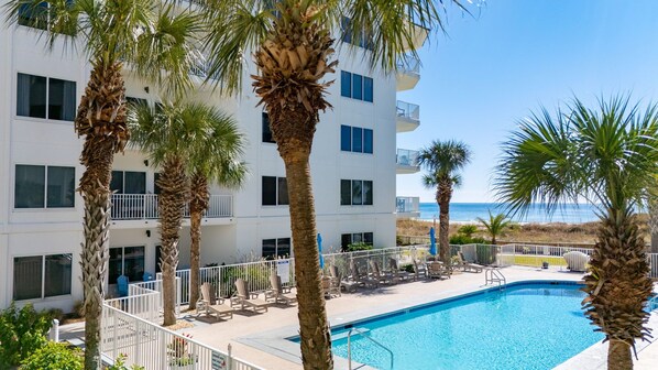 Palm Beach is a 5-story building located approximately 3.5 miles east of Hwy 59 in Orange Beach. Palm Beach has 2 outdoor pools (seasonally heated), free WiFi, a small fitness area, and a bbq grilling area. Guests go directly to Palm Beach to pick up their check-in package and pay for their parking passes.