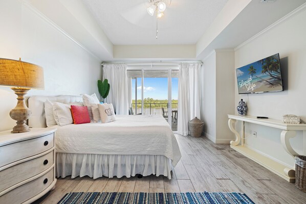 The primary bedroom is a private retreat with a king bed, balcony access, and a spa-inspired ensuite bathroom, complete with a tiled walk-in shower, separate soaking tub, and double sink vanity. The second bedroom features a queen bed and its own ensuite bathroom with a walk-in shower, offering added privacy and convenience. The third bedroom also includes a queen bed, providing flexible accommodations for guests or family.