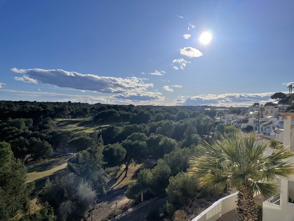 It features both a balcony on the first floor (south-facing) and a solarium (also south-facing) which offer breathtaking views of the golf course, the mountains, and the sea in the distance.
