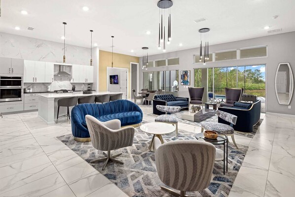 KITCHEN/DINING: The stunning, open-plan kitchen boasts generous counter space and barstool seating—a great spot for cooking and cocktails. For formal meals, set up your spread in the oversized dining room, which features seating for 16 guests (and conveniently doubles as a fabulous conference room, too)!