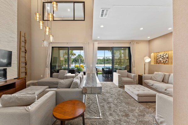• Living Room: Boasts double-height ceilings, beautiful sofas, chaise lounges, an electric fireplace, and a 55-inch TV, creating a spacious and luxurious ambiance.