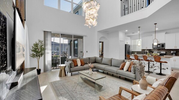 The best thing about staying here is you have all the luxuries of home right here with you. First, the fully furnished kitchen will have you whipping up meals in no time. With all the necessities, you’ll be able to enjoy home-cooked meals any time you want! There is plenty of seating for enjoying meals together at the dining room table and the kitchen bar. The kitchen overlooks the living room, making it easy to engage with family and friends. The living room features a large, comfy sectional sofa and 75-inch Smart TV and soundbar. The loft area features another 75-inch Roku TV, sound bar and ample seating, perfect for those family movie nights or must-see Sunday games. This home has a washer and dryer along with free Wifi for you to use at your convenience.