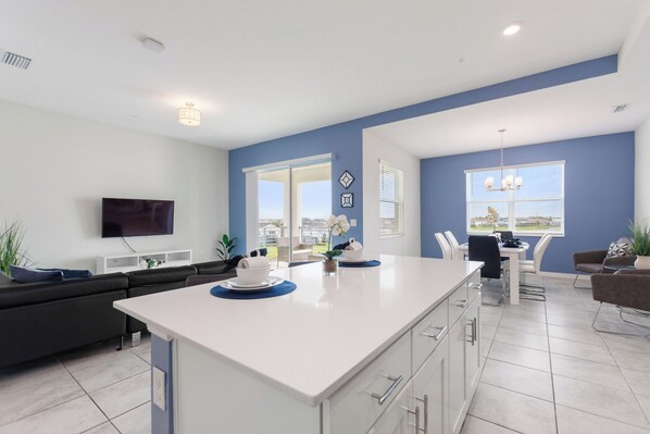 Naturally, with a modern, high end resort property, a fully-equipped kitchen with appliances stone counter-tops and all the appliances you might need for a resort stay. High-speed Internet Wi-Fi access of course and cable and smart TVs, linens and towels as well as a starter selection hotel style bathroom amenities to get you going for the first 24 hours on your self-catered trip.