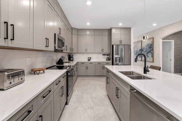 The party continues in the Kitchen, which features generous counter space and sleek white cabinetry, filled with all the gear and gadgetry you need to serve up a feast. The chic kitchen island with stools is a perfect place to lay out some appetizers and drinks, or to linger and chat over your morning coffee before a day of adventure in Orlando.
