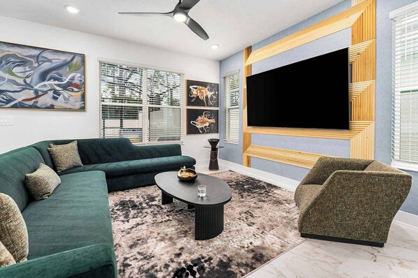 Follow the long, elegant foyer into the light-filled, open-plan living and dining room, and make yourselves at home! Sink into the plush sectional sofa or chic armchair for some conversation and connection. Or break out the snacks while you stream the game or a movie on the 75-inch flat-screen TV. At mealtime, a round dark-wood table with sleek, light blue dining chairs invites you to feast and make memories (in style).