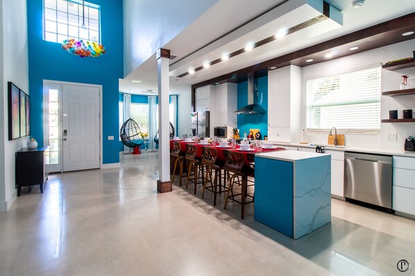 LIVING/DINING ROOM: Open living and dining floorplan. Vast kitchen island seats all 10 guests comfortably.