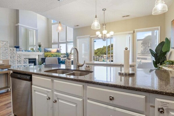 As you descend into the living area, you will first notice the vibrant colors of design shining in the natural light from the amazing windows. Your view extends beyond the cove to the main channel beyond as you gaze out the living room. Just steps away you will find a well furnished kitchen for all of your dining in delights; with comfortable seating inside and out.