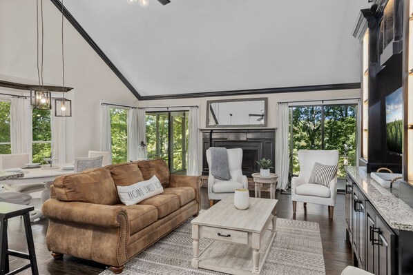 Master bedroom is located on main level also and includes a King bed, desk, deck access, TV and private bathroom with 2 sinks and tub/shower.