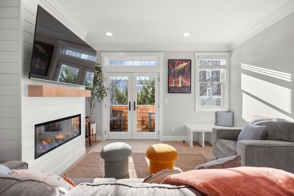 The main level’s open floor plan makes it easy to spend quality time with your favorite people and pups, whether you are enjoying your morning coffee on the balcony overlooking the courtyard, gathering around the custom round dining table for a fun game night, streaming your favorite shows on the 65 inch SmartTV over the cozy fireplace, (Fireplace currently unavailable) or crafting a meal in the fully-equipped kitchen. The living room TV is equipped with Apple TV for signing into your favorite streaming platforms with your own login credentials.