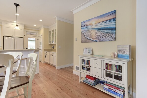 Whether you are looking to relax on the covered porches, stroll to the beautiful ocean beach, take walks on nature trails, ride bikes, or splash in puddles and play games by the fireplace, Sunny Side Up is a delightful place to stay! Located in Seabrook's Alderwood district in the center of the Seabrook neighborhood, it’s a short walk or bike to the beach and town, and just steps to the playground, dog park, community pool, and farm district where you can greet the ducks and horses. Named for the feeling you have when you enter, Sunny Side Up is truly a sunny and comfortable place – you won’t want to leave!