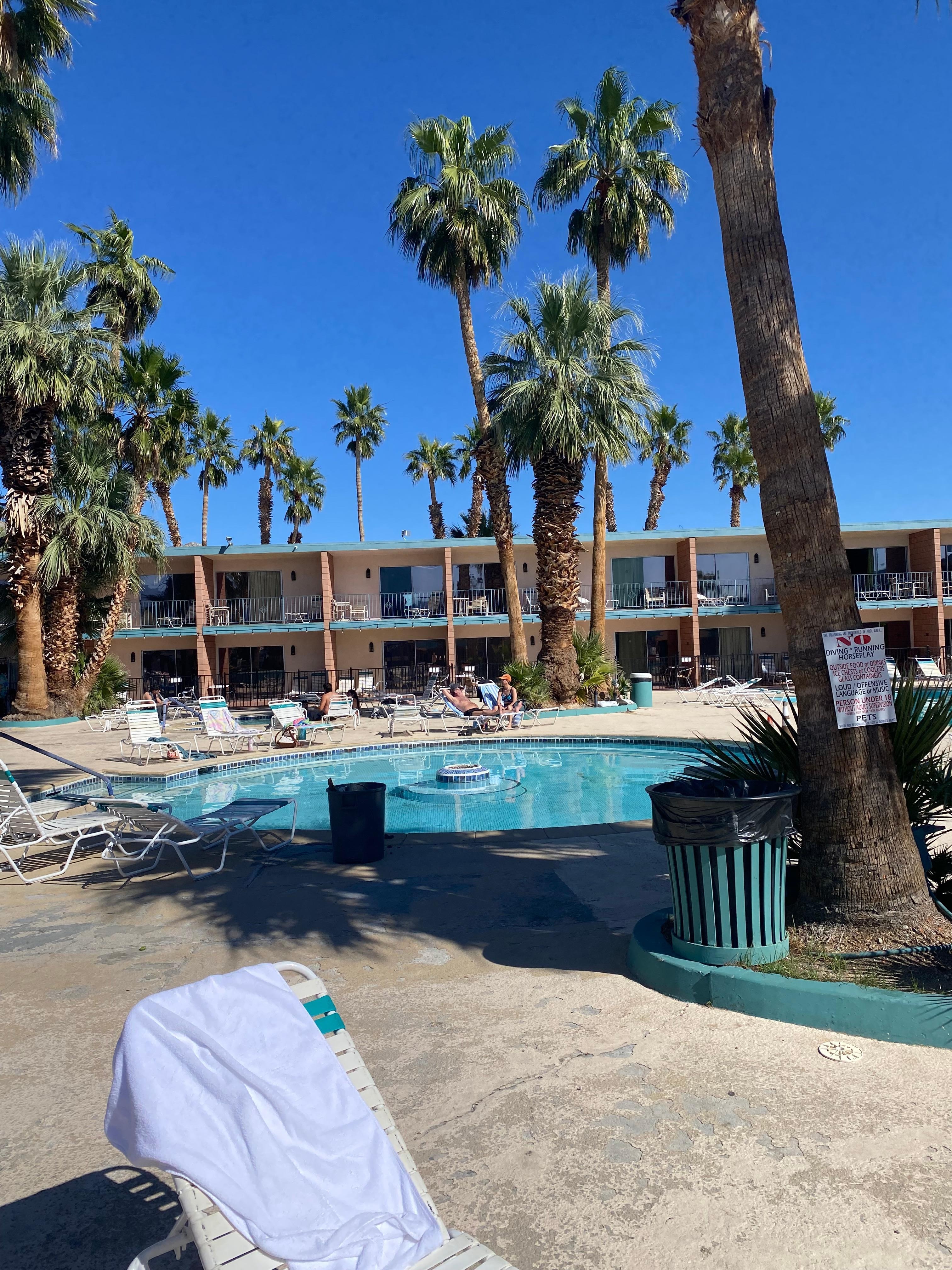 Maybe I'm just a sucker for retro but after a hellish time of trying to find a Decent hotel on our way home last minute, we finally found this place...As soon as I walked I to the lobby I was transported back in time...this place is not trying to be old palm desert, it is! A little rought around the edges because of the age in some areas but I love the vibe and friendly staff and want to come back. We did eat at the lounge and not only was the food delicious, the bar was so old school and the female bartender, literally would bust out tunes and a microphone and sing a