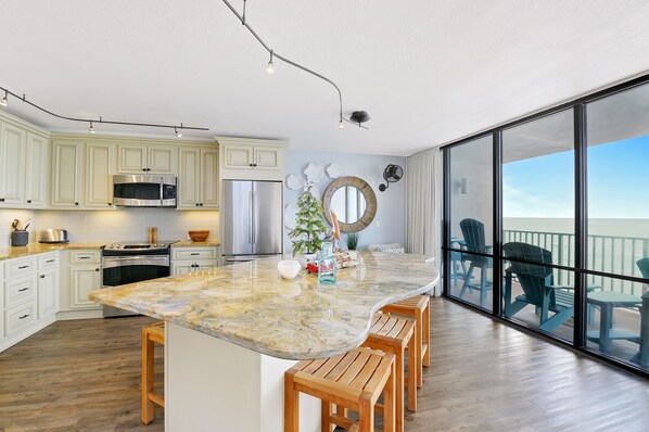 Your stylish kitchen has the space and all the equipment you need to prepare beach snacks, whip up a sandwich for lunch, or even craft a home-cooked meal. You may even feel inspired to concoct a coastal cocktail and enjoy it out on your private balcony while savoring beautiful views of the sun setting on the shoreline.