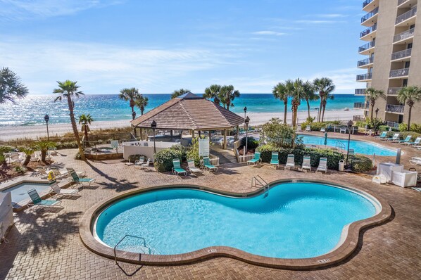 - Oceanfront-yksikkö lattiasta kattoon ulottuvalla lasilla, joka avautuu upealle suurelle parvekkeelle olohuoneesta ja päällikön sviitistä. Nauti valkoisista hiekkarannoista ja kauniista kirkkaan sinisistä Meksikonlahden vesistä suoraan kotoasi!