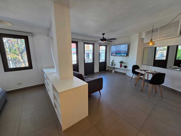 Modern and cozy 48 m² apartment with a private balcony 🌿 for up to 3 guests 🏡. It features a double bed and a sofa bed, 1 full bathroom, and functional spaces ✨. Guests can also enjoy the rooftop terrace 🌆🍹, perfect for relaxing .