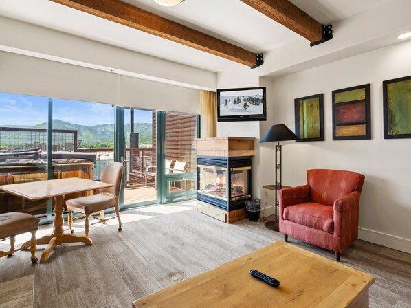Unwind in this spacious living area where mountain elegance meets modern functionality. The premium leather queen sofa sleeper accommodates additional guests, while the ingenious coffee table transforms into an elevated dining surface with hidden storage beneath. Gather around the cozy gas fireplace after a day of adventure to enjoy your favorite shows on the Smart TV (Roku), or step out to your private balcony to soak in those panoramic views that overlook the Olympic legacy landscape. The separate dining table and chairs provide the perfect spot for mountain meals and planning your Park City experiences.