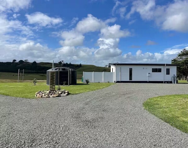 The space This charming tiny home, custom-designed and built in 2024, offers all the amenities of a full-sized house within a compact, eco-conscious footprint. Set on a spacious 7,000m² north-facing property, the home captures all-day sun and stunning views of rolling hills. Watch wild pigs, turkeys, cows, birds and swans roam the valley—or enjoy spectacular stargazing at night.