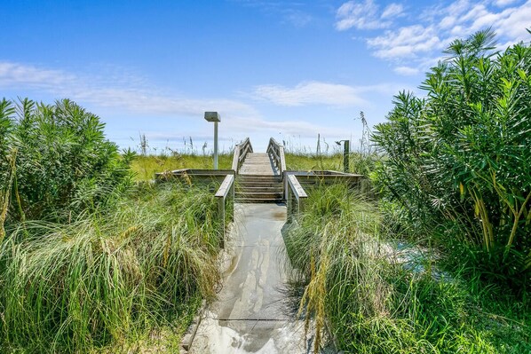 You’ll find sleeping arrangements for up to eight guests comfortably with two bedrooms and a sleeper sofa in the living room. The primary bedroom offers a relaxing haven for rest and relaxation with a Smart TV and an en suite bathroom. This is the perfect place to get a good night’s sleep after a long beach day.