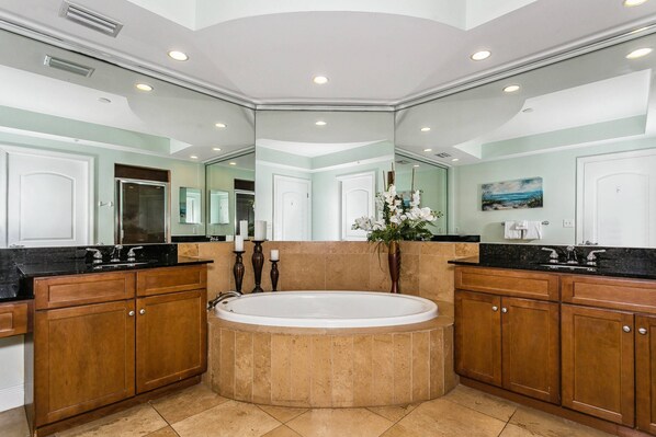 The master suite features a king-size bed with a top-of-the-line mattress & comfortable bedding, a TV, & a large picture window where you can enjoy Gulf views without leaving your bed! The en suite bathroom offers an oversized jetted garden tub, a separate travertine-tiled glass shower & double vanities with granite countertops.