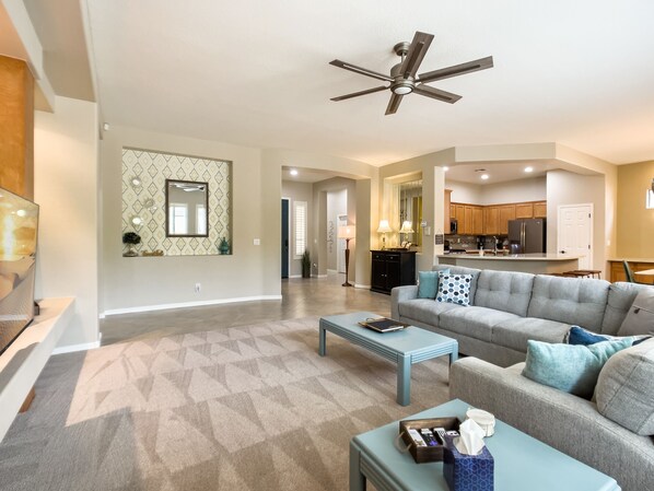 This pristine three-bedroom, two-bathroom home offers all the amenities for a perfect vacation getaway or suits as a home away from home. Step into our modern home with a seamless blend of indoor and outdoor spaces. The open floor plan, high ceilings, and well-equipped kitchen create a luxurious experience. Unwind on the spacious living room couch or enjoy the private backyard with an outdoor dining area, grill, and comfy seating options. Relax in the hammock, shaded by retractable sun shades during the day and illuminated by Edison-style bulbs in the evening—a serene outdoor living space perfect for soaking in the Anthem, Arizona sunshine.