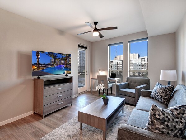 This private 2 bedroom apartment is a comfortable home away from home! Our fully furnished apartments in Downtown Phoenix are spacious apartments accessorized with custom furnishings, kitchens featuring full-size appliances, cookware, silverware, glassware, and dishes. Each furnished apartment has its own full-size washer and dryer, luxury bed and bath linens, and abundant closet space. There are HDTVs in the living room and every bedroom, and all utilities are included featuring high-speed WiFi.