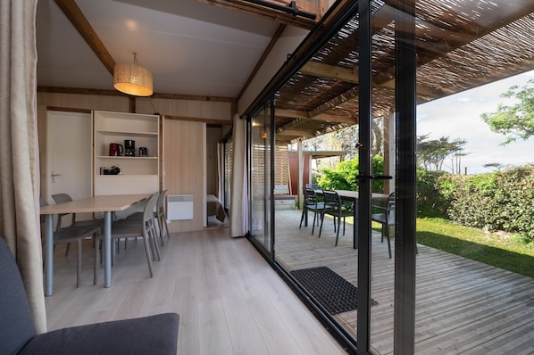Enjoy your 19 m² covered terrace with outdoor dining for 5–6 and a lounge area. The beach is just 500 m away—perfect for daily seaside outings.