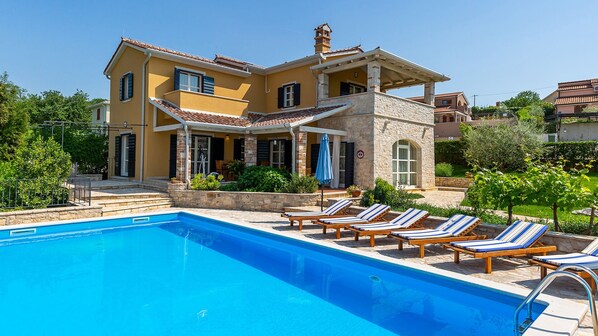 In the courtyard of the villa you will find a true green oasis. Surrounded by greenery and Mediterranean trees, Villa Salvea will provide you with the kind of vacation you've been dreaming of for a long time. The natural fence will ensure maximum privacy so you can swim and sunbathe without any worries. We think the 50 m² pool will be quite enough for swimming and the good news is that the pool is heated so you don't have to give up swimming even on colder days or evenings. Next to the pool are sun loungers where you can sunbathe, relax, or read your favorite book, and then move over to the jacuzzi and enjoy to your heart's content.