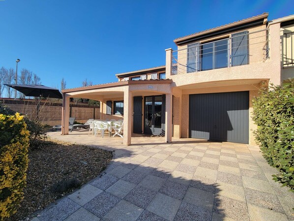 Villa located in the secured residence of "Les portes du soleil" just 400m from the sea, 2 communal swimming pools and entertainment for the children ( june to sept - access extra to pay). This corner villa has 3 bedrooms and bathroom with toilet upstairs and downstairs a living room with equipped kitchen and airco, shower room and toilet. Outside a terrace with porch-roof and hedges and one parking place in front of the garage (access to a part of the garage).