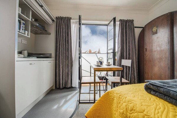 Located in characterful Art Deco building, this compact front-facing studio has a Juliet balcony that brings in plenty of natural light. The studio includes a kitchenette, ensuite bathroom, dining table and smart TV. Just a short walk to the seafront, Kings theatre and plenty of shops, bars, cafes and restaurants. A practical and comfortable base, best suited for solo travellers and couples.