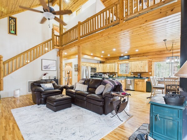 As you enter the chalet, you’ll be welcomed by a warm and inviting main living area featuring a large, comfortable couch and oversized chair with ottoman, perfect for relaxing by the electric indoor fireplace or wood-burning stove fireplace. The entertainment setup includes an 85-inch smart TV, surround sound system, and record player — ideal for movie nights or enjoying your favorite albums. A nearby cabinet is stocked with a variety of board games — perfect for family game nights or relaxing afternoons.