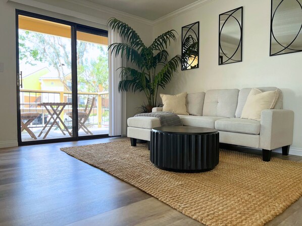 Welcome to your modern, escape in a peaceful gated community, ideally situated near everything you want to see and do. This clean and thoughtfully designed 2-bedroom, 1-bath condo features a king and queen bed, perfect for couples, small families, or business travelers seeking comfort and simplicity.