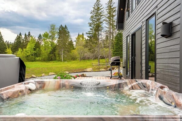 • Unwind in the outdoor spa surrounded by trees, ideal after a long ride, hike, or hunt.