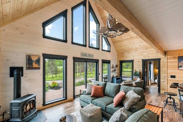 • The open-concept living space features a gas fireplace, large windows with forest views, and a comfortable layout for gathering or watching a movie.