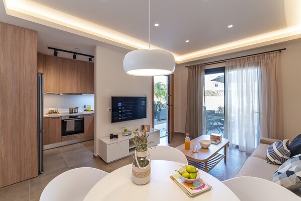 Lucian City apartments are located in the center of Rhodes, only a 5 minute drive from the nearest incredible beach. The 4 beautifully crafted apartments are quite functional and will offer you everything you might need during your stay in Rhodes. Narcissus apartment is found on the ground floor and accommodates up to 3 guests. It has 1 fully air-conditioned bedroom with a double bed. Theres a comfy single sofa bed in the living room and a bathroom with a shower. The apartment has a fully equipped kitchen that is suitable for any meal preparation as well as a sitting area. Theres a comfortable living room with a smart TV and free Wi-Fi access throughout the property. Also, there is a sitting area to enjoy the sun!The sofa bed is only suitable for a child up to 12 years old. It cannot accommodate anyone older.
