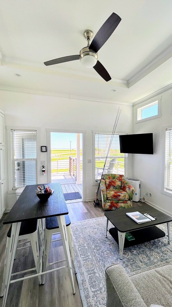 Well designed living area with all you could need for a good visit. The location is ideal. You can see the bay across a grassy field from the unit. Lots of nature to observe: Deer at night and morning. Whooping cranes that fly over the roof and land across the street. Sand hill cranes calling. We plan to come again.