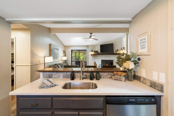 Living Spaces: Cozy and Inviting The sun porch is the heart of The Coves, where you can sip your morning coffee while watching the birds or enjoy a post-lake day cocktail as the sun sets. The back porch beckons you for alfresco dining with its spacious outdoor table, and the fire pit area invites you to gather around for s'mores and stories under the stars.