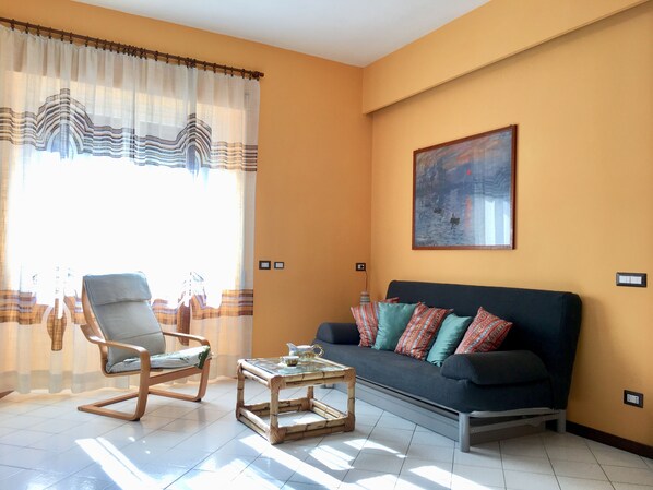 Valoisa ja aurinkoinen asunto, nelikerroksisessa rakennuksessa, joka sopii erinomaisesti sekä pariskunnille että lapsiperheille. Talossa on: iso eteinen, iso vaatekaappi, makuuhuone parivuode ja kirjahyllyt, työ- ja tietokonealue, iso huone, jossa vuodesohva kahdelle ja yksi vuodesohva; TV, ilmastointi jokaisessa makuuhuoneessa; iving pöytä ja 5 tuolia sekä astiat ja huonekalut, mikroaaltouunilla varustettu syömiskeittiö, sähköuuni, kaasuliesi, jääkaappi ja pakastin, vedenkeitin, mokakahvinkeitin, ranskalainen kahvinkeitin, käsisekoitin; kylpyhuone suihkulla ja bideellä; pesutupa, jossa pesukone ja ruokakomero. Suuri valoisa terassi, jossa on aurinkovarjo ja pöytä, jossa on neljä tuolia, sopii käytettäväksi keväällä ja kesällä.
