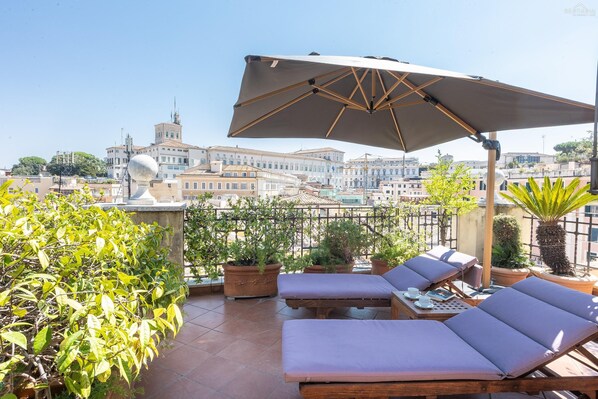 Arvostettu kaksikerroksinen huoneisto sijaitsee hissillisen palatsin viidennessä kerroksessa Largo Pietro di Brazzàlla, lähellä Trevin suihkulähdettä, Quirinalen palatsia ja Via del Corson ostosaluetta. Alakerrassa on kaksi mukavaa kahden hengen makuuhuonetta, täysin varusteltu keittiö, kylpyhuone suihkulla, toinen kylpyhuone ja suuri ja valoisa olohuone ruokailutilalla ja pääsy upealle terassille, jolta on henkeäsalpaavat näkymät Rooman kattojen ylle. Yläkerrassa, johon pääsee sisäportaita pitkin, on toinen kahden hengen makuuhuone vaatehuoneella ja kylpyhuone poreammeella ja suihkulla – kaikista tämän kerroksen huoneista on uskomaton näköala Ikuisen kaupungin kauneuteen, mukaan lukien vilaukset Trevin suihkulähteestä, Pietarinkirkosta ja Vittorianosta. Lopuksi kierreportaita pitkin pääsee toiselle terassille, jolta avautuu ainutlaatuinen 360° näkymä kaupunkiin. Tässä huoneistossa on ilmastointi, LCD-televisio, Wi-Fi, pesukone ja astianpesukone, ja sitä voidaan epäilemättä pitää arvokkaana jalokivenä maailman kauneimman kaupungin sydämessä.