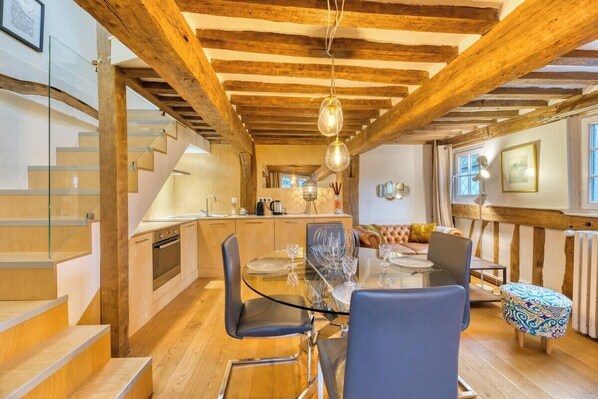 Discover the charm of an old and atypical home, completely renovated to offer a unique experience. Le Guillaume is a duplex flat full of character, with a fully fitted and equipped kitchen opening onto the living room, a shower room with WC and two bedrooms.