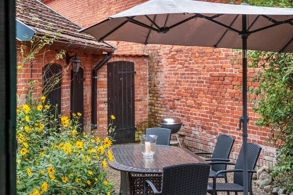Step outside to your private uncovered terrace where you can access a shared grill for outdoor meals while enjoying the peaceful natural surroundings.