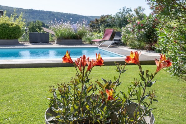 The private outdoor area includes a fenced pool, hot tub, garden, two terraces (open and covered), barbecue, pizza oven, and outdoor shower. The pool and hot tub are open from mid-May to late September. Guests enjoy panoramic mountain views and a peaceful setting ideal for relaxation.