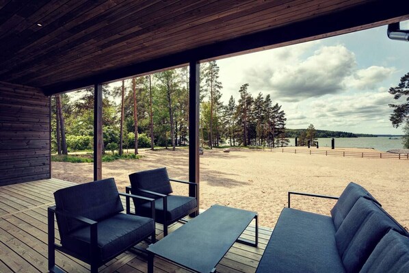 Ulkoa löytyy katettu terassi, ruokailualue, grilli ja oleskelualue, josta voit ihailla henkeäsalpaavia näkymiä Finnarin lahdelle. Aivan terassin vieressä on suuri hiekkaranta. Se sopii täydellisesti esimerkiksi lasten rantaleikkeihin, joita voit pitää silmällä omalta terassilta käsin.